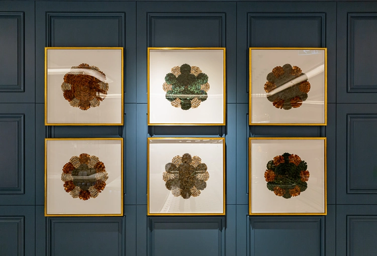 On the far side of the buffet is a sextet of artworks by California-based art house and design studio Natural Curiosities. Part of the "Queen Victoria" series, these commissioned works layer responsibly sourced feathers to create mesmerising circular patterns that invite you to consider our relationship with nature.