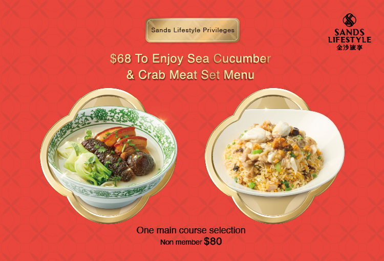 Sands Lifestyle members can enjoy the limited time set menu for only $68 at selected restaurants. Enjoy a mouth-watering appetizer paired with sea cucumber or crab meat dishes! Every bite is a blast of taste!