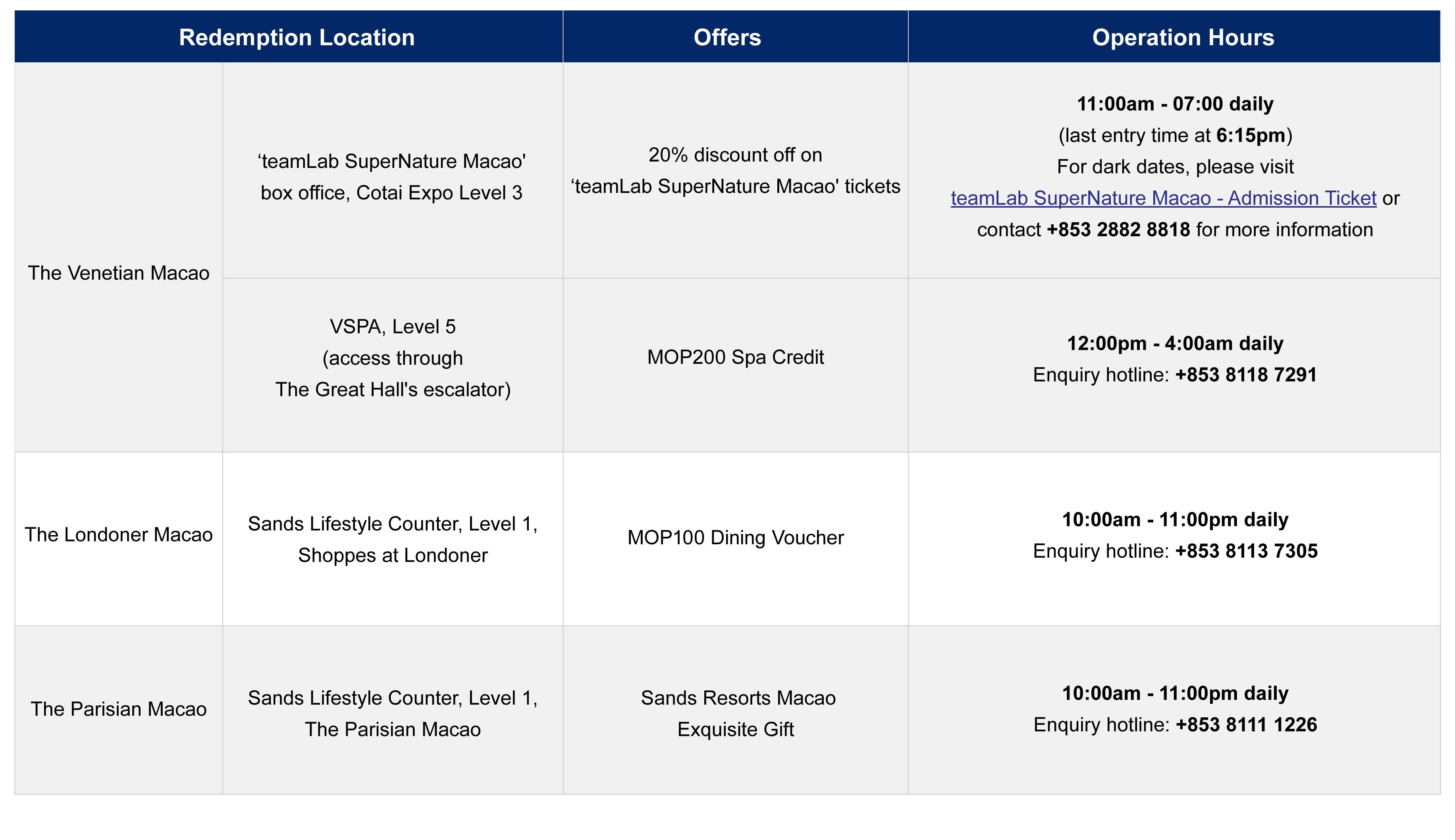 Enhance your travel experience at Sands Resorts Macao with new privileges specially for Air Macau Boarding Pass holders. Enjoy special benefits such as MOP100 Dining Voucher, Sands Resorts Macao exquisite gift, and much more exciting offers.