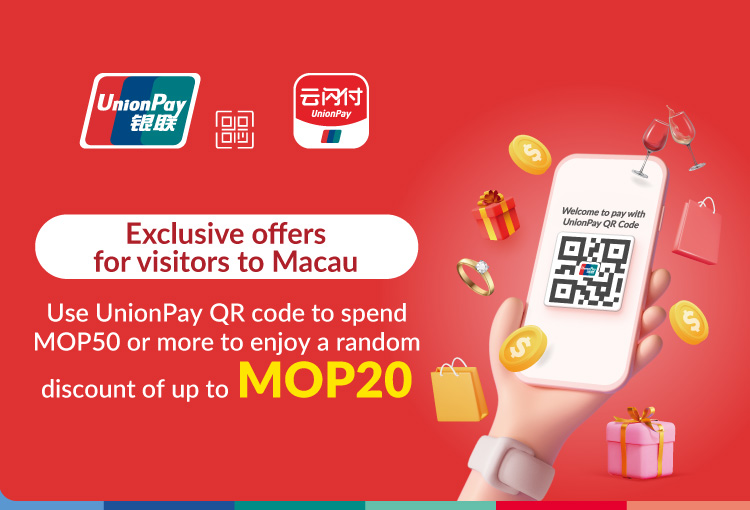 Visitors to Macau with UnionPay Card issued outside Macau bound to payment apps can enjoy a random instant discount of up to MOP20 when making a single transaction of MOP50 or more by using UnionPay QR Code Payment through the UnionPay network. Each card can enjoy the offer up to five times per day.