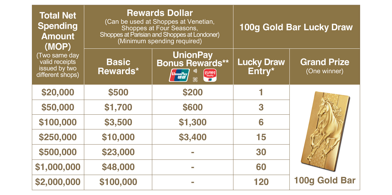 Spend MOP20,000 or more at Shoppes at Venetian, Shoppes at Four Seasons, Shoppes at Parisian and Shoppes at Londoner to earn up to MOP100,000 Rewards Dollar. You can even enter the Lucky Draw and win a 100g gold bar! On top of that, spending with UnionPay Card to earn up to MOP3,400 additional Rewards Dollar! Rewards Dollar can be used at over 400 participating shops and kiosks throughout Sands Shoppes Macao.