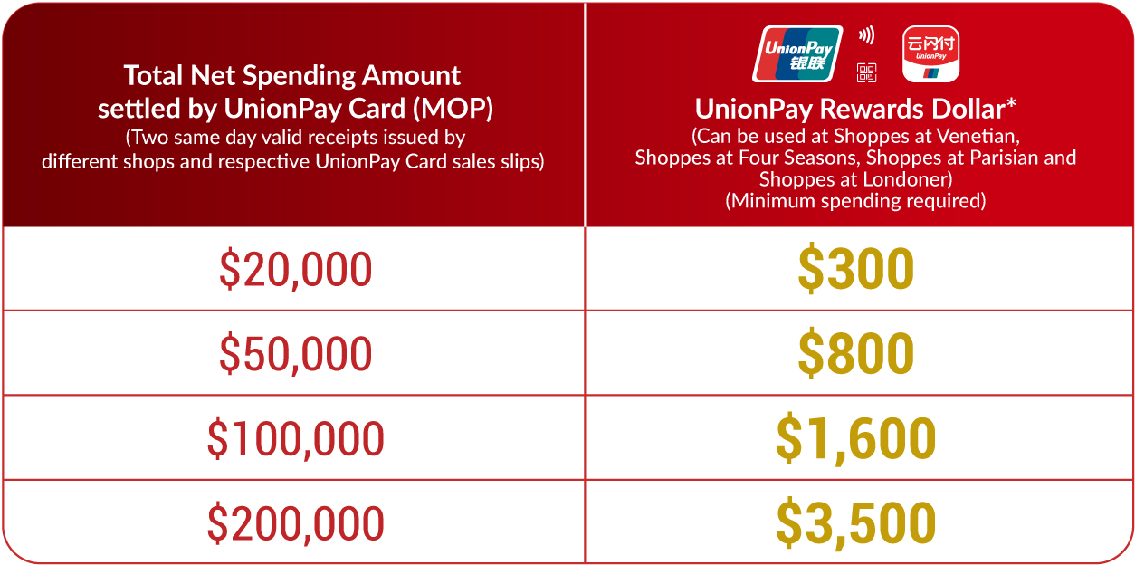 Spend MOP20,000 or more with UnionPay Card at Shoppes at Venetian, Shoppes at Four Seasons, Shoppes at Parisian and Shoppes at Londoner within 12th – 14th, 19th – 28th December 2025 and 1st – 4th January 2026 to earn up to MOP3,500 UnionPay Rewards Dollar! These can be used at over 500 participating shops and kiosks throughout Sands Shoppes Macao.