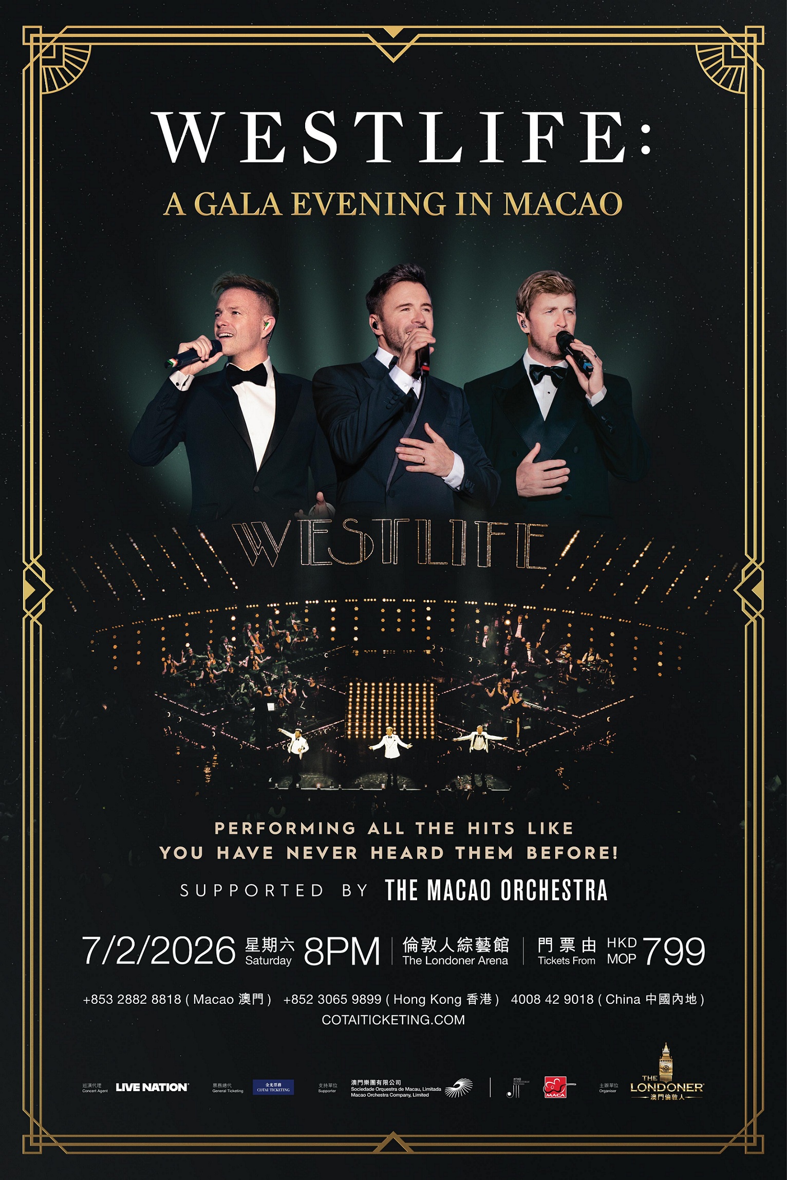 (Macao, Dec.12, 2025) – Legendary pop group Westlife will captivate fans like never before at The Londoner® Macao’s The Londoner Arena on February 7, 2026, with Westlife: A Gala Evening in Macao. Celebrating 25 years of music, the hit-filled performance with The Macao Orchestra presents a unique opportunity to witness the group’s iconic songs reimagined. Tickets will go on sale from 12p.m. on Dec. 16, 2025 (Tuesday) via Cotai Ticketing, Damai and Macau ticketing.