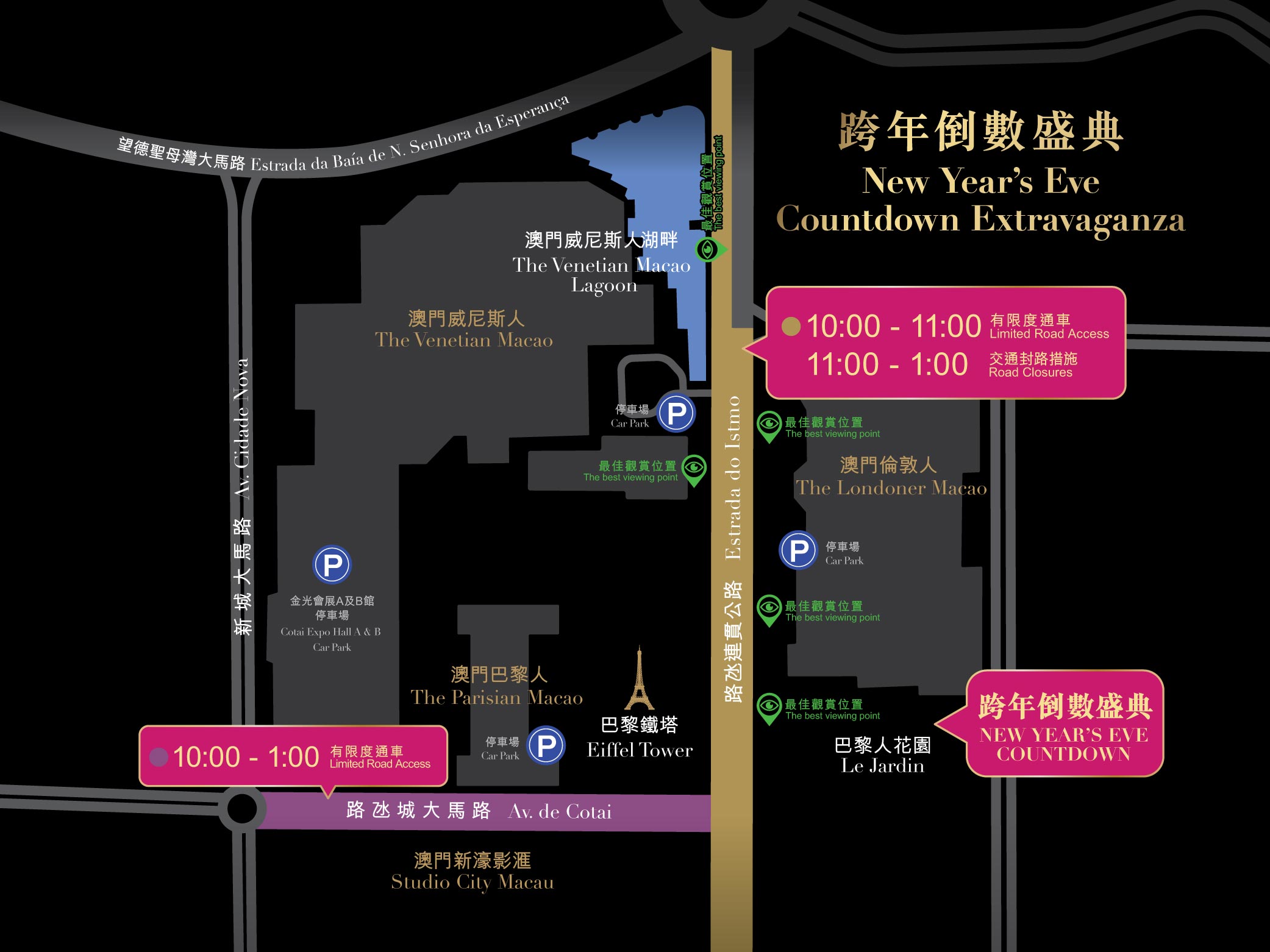 To ensure a smooth experience for guests, special traffic measures will be implemented on the Cotai Strip. Road access limited from 10:00pm to 11:00pm and road closures from 11:00pm to 1:00am. Shuttle services and self-parking arrangements are also adjusted.