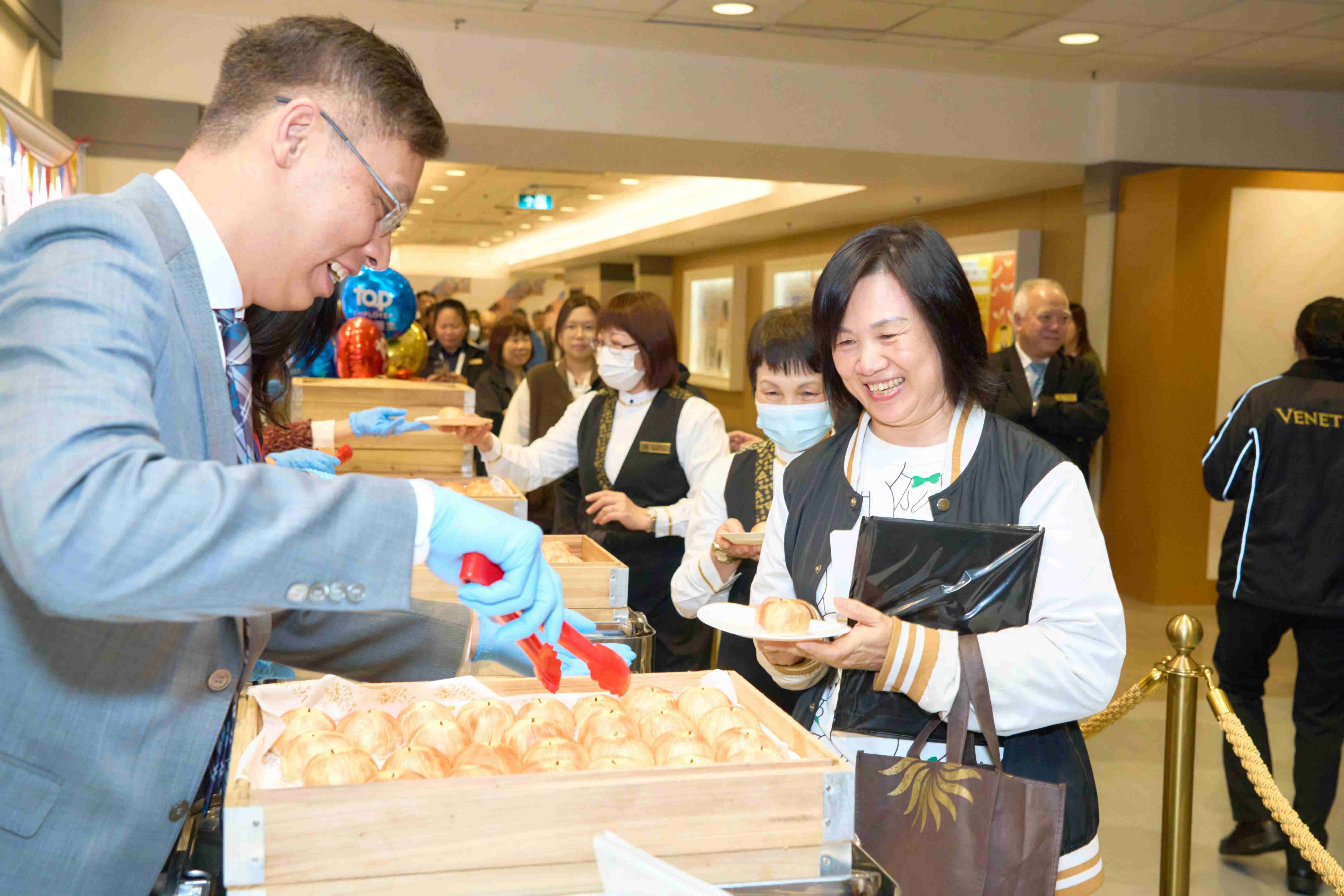 Photo caption: Sands China executives distribute special pastries to team members at back-of-house areas to celebrate the “Top Employer” award, thanking them for their dedication and contributions.