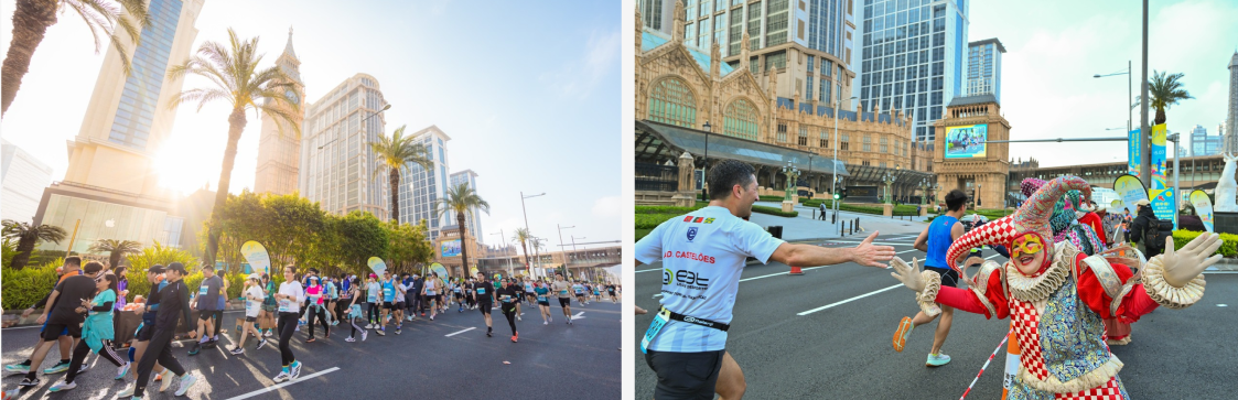 Photo caption: After taking off from the starting line at Sai Van Lake Square, runners cross the Sai Van Bridge and pass by The Venetian Macao, The Parisian Macao and The Londoner Macao before finishing up at the Olympic Sports Centre Stadium. Street performers from Sands China created a festive atmosphere and cheered the runners on throughout the course.