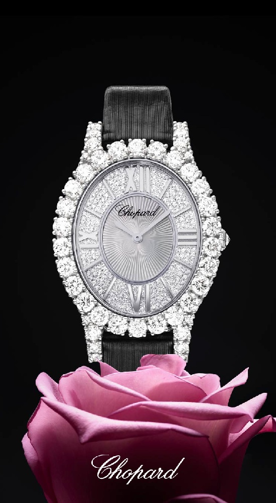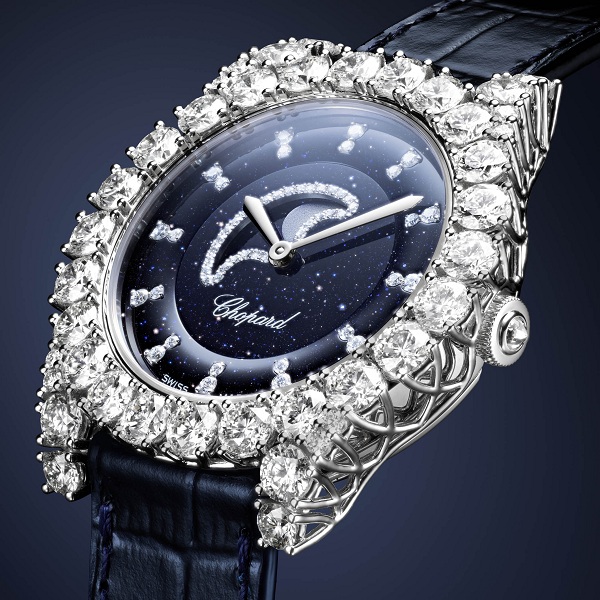 Following the lunar cycle through the sparkling nuances of aventurine glass and the fire of diamonds magnified by the crown-setting technique. L'Heure du Diamant Moonphase combines Chopard's dual expertise in watchmaking and jewellery.