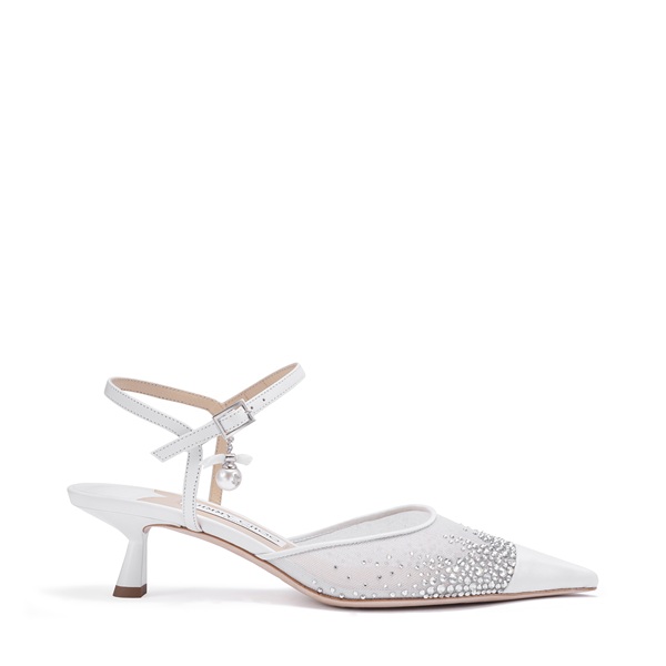 A contemporary slingback in degrade crystal mesh, the Aren features a pointed toe, sculpted heel and a delicate pearl charm for a refined finish. Approximately 470 crystals are applied to each pair, with different sizes and shapes combined to replicate the shape of a flame.