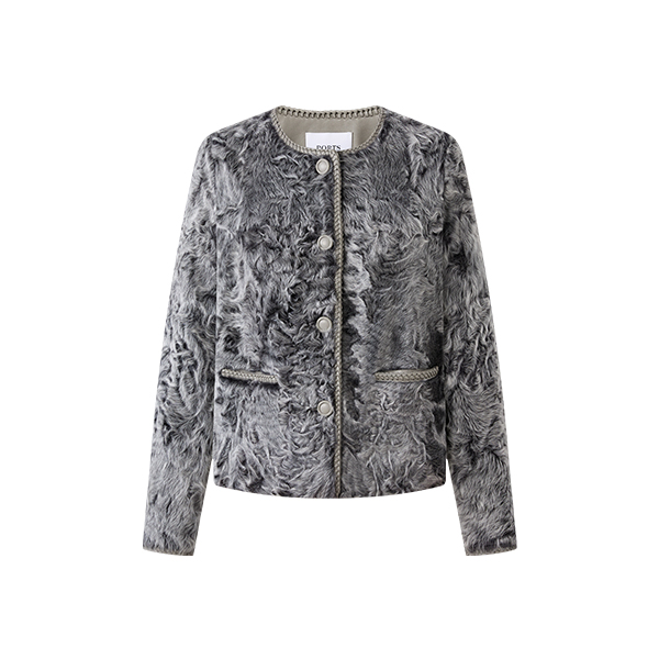 Crafted from selected natural shearling, it features a soft leather base and a dense, plush pile. The hide's natural "ribbed pattern" boasts a delicate luster, epitomizing luxury in fur fashion. Woven leather edges define the silhouette, while structured details enhance dimensionality. The straight-cut design offers versatile styling possibilities, creating a chic and relaxed ambiance.
