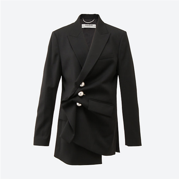 Black, wool blend, asymmetrical design, faux pearl buttons, shirring details, peaked lapel, front button closure, chest patch pocket, two side flap pockets, side slit details, long sleeves, slit cuffs, back center vent.