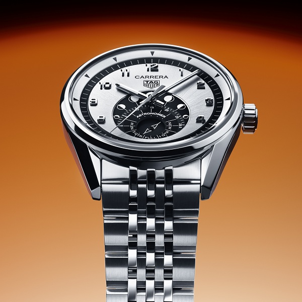 TAG Heuer has launched the TAG Heuer Carrera Astronomer series at the 2025 Geneva Watch Fair, offering a fresh take on moon phase watches. This model features the new Calibre 7 movement, which boasts a 50-hour power reserve and powers the moon phase mechanism. At the six o'clock position, a rotating disc displays seven moon phases, with two slender hands moving daily to indicate the current phase within the 29.5-day cycle. The watch has a stainless steel case and silver dial, paired with a brushed and polished seven-link bracelet. The black inner bezel and moon phase disc evoke a starry sky, while deep gray accents add dynamism. The rhodium-plated hands are coated with white Super-LumiNova® for easy readability day and night.