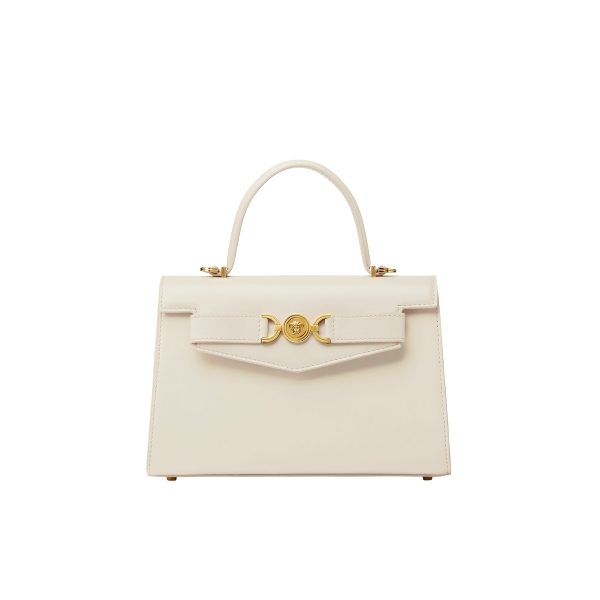 A medium-sized handbag with belt detail featuring the Medusa '95 hardware, the iconic House code first seen in the 1995 collections. The top handle design is made from smooth, flat-grain leather with a magnetic foldover flap and a detachable crossbody shoulder strap.